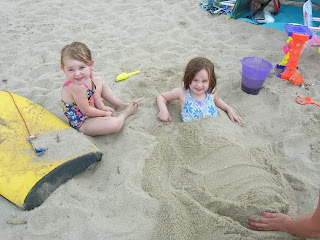 Jessica and I took the kids to the beach on Tuesday. We ran into some friends in the parking lot so there was a big group of us with lots of 2-6 year olds jumping in the water and building in the sand. Ellen wore her googles and put her head under water where she saw "2 rainbow fish". Nothing like a perfect day at the beach!